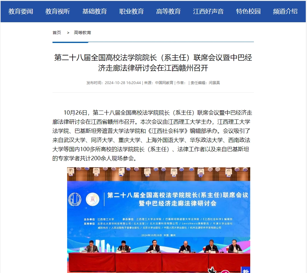 10月26日,第二十八届全国高校法学院院长(系主任)联席会议暨中巴经济走廊法律研讨会在江西省赣州市召开。本次会议由江西理工大学主办,江西理工大学法学院、巴基斯坦旁遮普大学法学院和《江西社会科学》编辑部承办。会议吸引了来自武汉大学、同济大学、重庆大学、上海外国语大学、华东政法大学、西南政法大学等国内100多所高校的法学院院长(系主任)、法律工作者以及来自巴基斯坦的专家学者共计200余人现场参会。