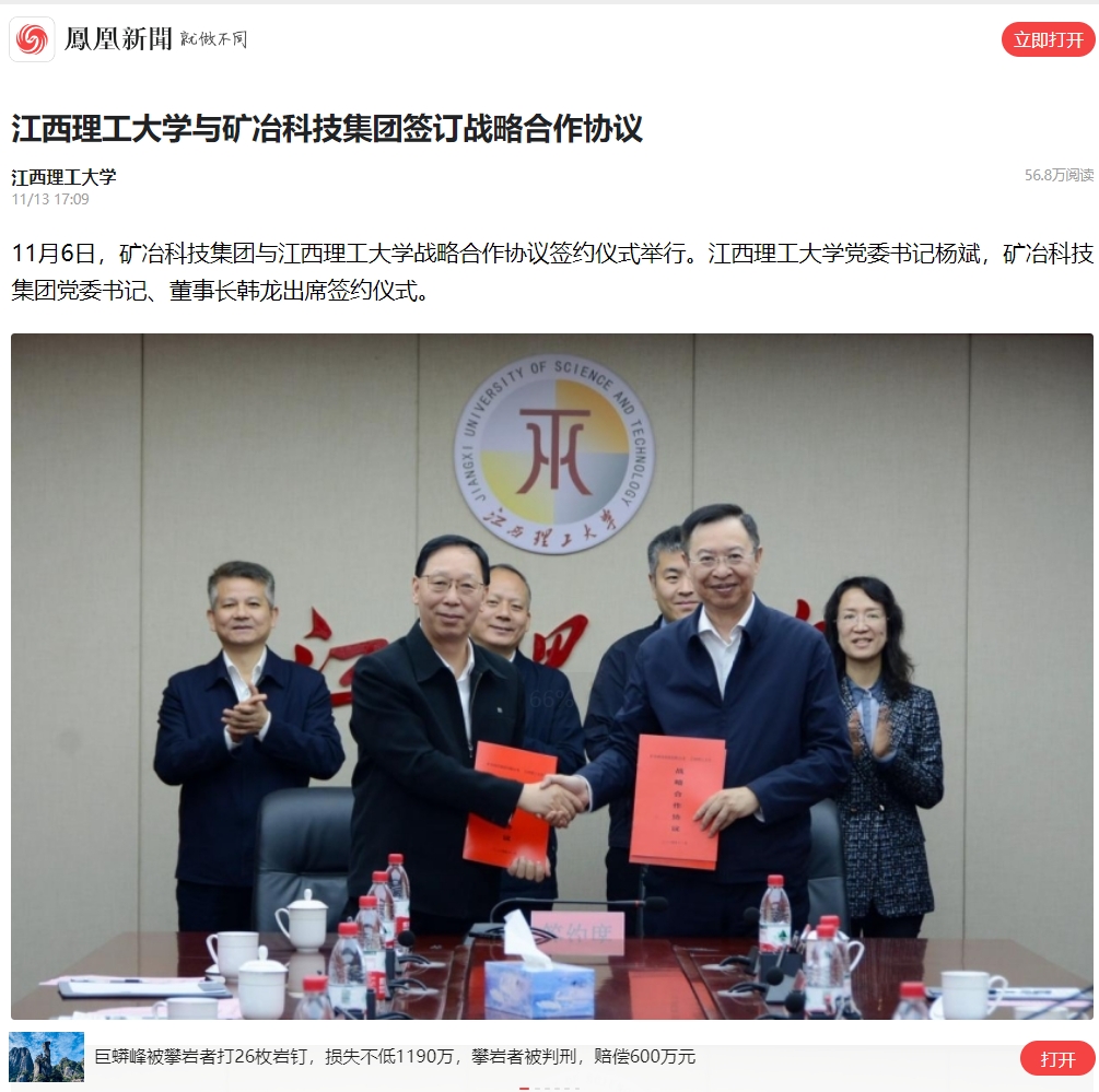 11月6日,矿冶科技集团与江西理工大学战略合作协议签约仪式举行。江西理工大学党委书记杨斌,矿冶科技集团党委书记、董事长韩龙出席签约仪式。
