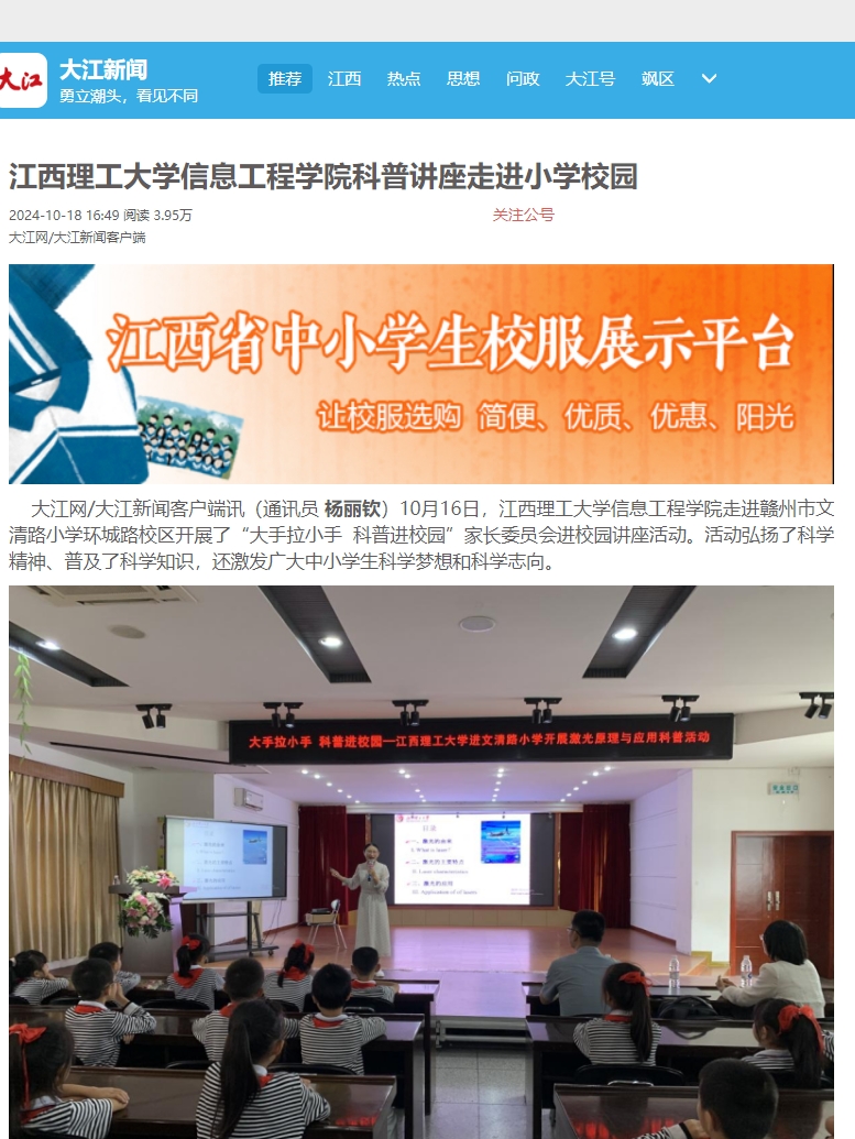 大江网/大江新闻客户端讯(通讯员杨丽钦)10月16日,江西理工大学信息工程学院走进赣州市文清路小学环城路校区开展了“大手拉小手 科普进校园”家长委员会进校园讲座活动。活动弘扬了科学精神、普及了科学知识,还激发广大中小学生科学梦想和科学志向。