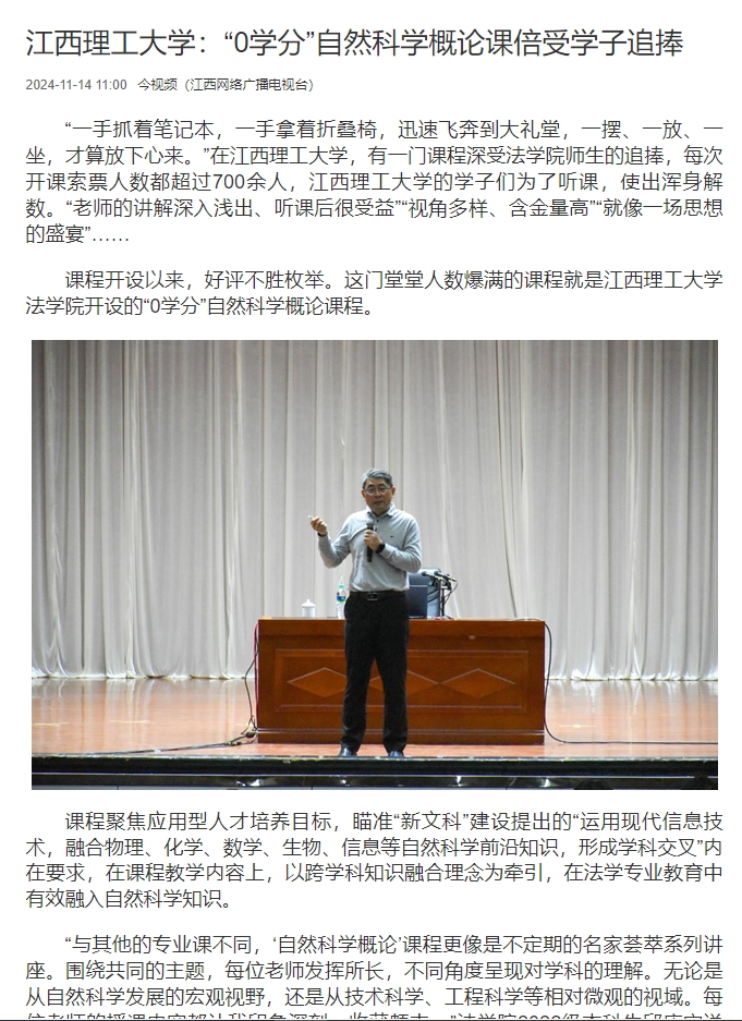 “课程并不是单向输出,而是多层次互动,课程以学生为中心,不仅及时回答学生提出的问题,而且还会将学生的意见作为课程内容更新、教学形式变化的重要依据,不断完善内容,持续提升教学质量。”江西理工大学法学院副院长张奇表示。“学生对这个课程反响积极、评价很高、期待很多。学院将继续坚持吸收最前沿的内容、集中优秀的教师、给予全面的保障,开设好自然科学概论这门重要课程。”