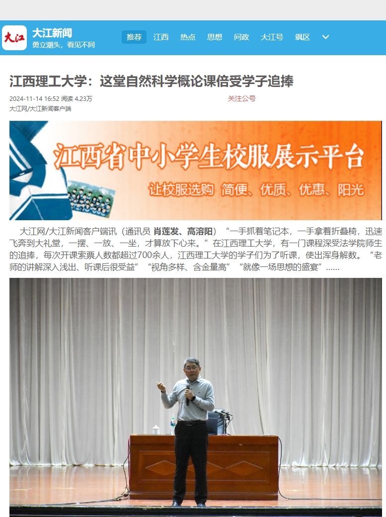 “课程并不是单向的输出,而是多层次的互动,课程以学生为中心,不仅及时回答学生提出的问题,而且还会将学生的意见作为课程内容更新、教学形式变化的重要依据,不断完善内容,持续提升教学质量。”江西理工大学法学院副院长张奇表示。“学生对这个课程反响积极、评价很高、期待很多。学院将继续坚持吸收最前沿的内容、集中优秀的教师、给予全面的保障,开设好自然科学概论这门重要课程。”