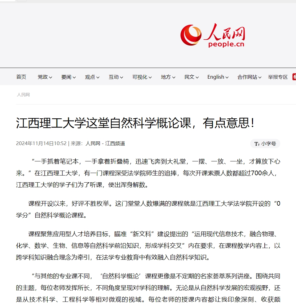 “课程并不是单向的输出,而是多层次的互动,课程以学生为中心,不仅及时回答学生提出的问题,而且还会将学生的意见作为课程内容更新、教学形式变化的重要依据,不断完善内容,持续提升教学质量。”江西理工大学法学院副院长张奇表示。“学生对这个课程反响积极、评价很高、期待很多。学院将继续坚持吸收最前沿的内容、集中优秀的教师、给予全面的保障,开设好自然科学概论这门重要课程。”