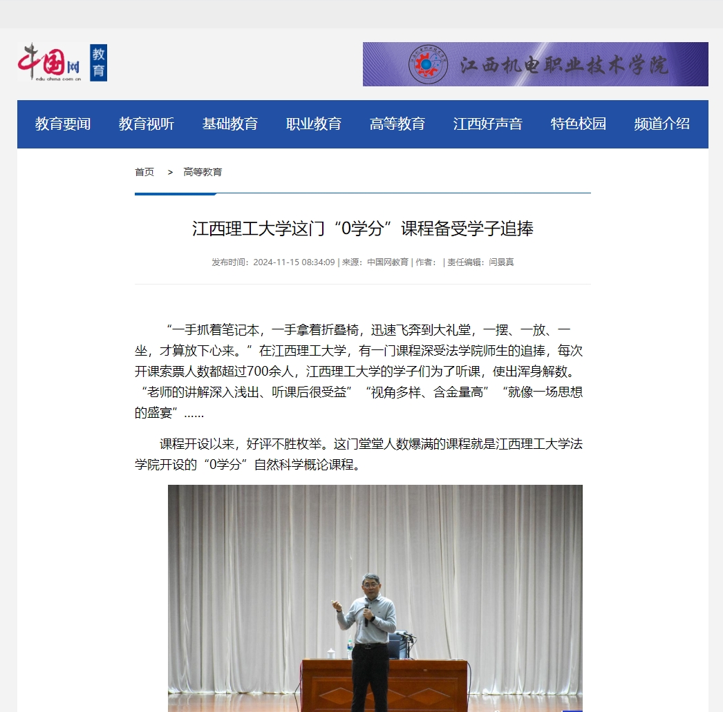 “课程并不是单向的输出,而是多层次的互动,课程以学生为中心,不仅及时回答学生提出的问题,而且还会将学生的意见作为课程内容更新、教学形式变化的重要依据,不断完善内容,持续提升教学质量。”江西理工大学法学院副院长张奇表示。“学生对这个课程反响积极、评价很高、期待很多。学院将继续坚持吸收最前沿的内容、集中优秀的教师、给予全面的保障,开设好自然科学概论这门重要课程。”