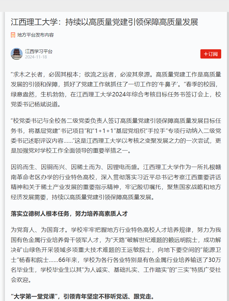 因钨而生、因铜而兴、因稀土而为、因锂电而盛。江西理工大学作为一所扎根赣南革命老区办学的行业特色高校,深入贯彻落实习近平总书记考察江西重要讲话精神和关于稀土产业发展的重要指示精神,牢记殷切嘱托,聚焦国家战略和地方经济发展需要,持续以高质量党建引领保障高质量发展。