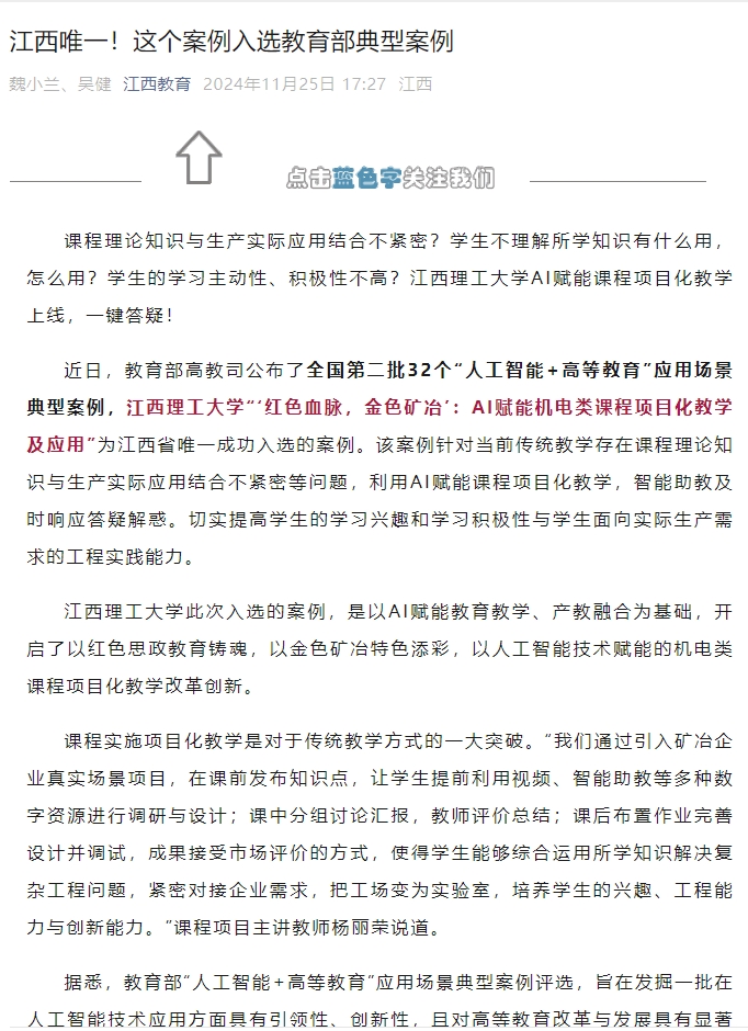 近日,教育部高教司公布了全国第二批32个“人工智能+高等教育”应用场景典型案例,江西理工大学“‘红色血脉,金色矿冶’:AI赋能机电类课程项目化教学及应用”为江西省唯一成功入选的案例。该案例针对当前传统教学存在课程理论知识与生产实际应用结合不紧密等问题,利用AI赋能课程项目化教学,智能助教及时响应答疑解惑。切实提高学生的学习兴趣和学习积极性与学生面向实际生产需求的工程实践能力。江西理工大学此次入选的案例,是以AI赋能教育教学、产教融合为基础,开启了以红色思政教育铸魂,以金色矿冶特色添彩,以人工智能技术赋能的机电类课程项目化教学改革创新。课程实施项目化教学是对于传统教学方式的一大突破。“我们通过引入矿冶企业真实场景项目,在课前发布知识点,让学生提前利用视频、智能助教等多种数字资源进行调研与设计;课中分组讨论汇报,教师评价总结;课后布置作业完善设计并调试,成果接受市场评价的方式,使得学生能够综合运用所学知识解决复杂工程问题,紧密对接企业需求,把工场变为实验室,培养学生的兴趣、工程能力与创新能力。”课程项目主讲教师杨丽荣说道。据悉,教育部“人工智能+高等教育”应用场景典型案例评选,旨在发掘一批在人工智能技术应用方面具有引领性、创新性,且对高等教育改革与发展具有显著推动作用的实践案例,从而在更广的范围内发挥示范引领作用,促进人工智能赋能教育教学的创新发展。