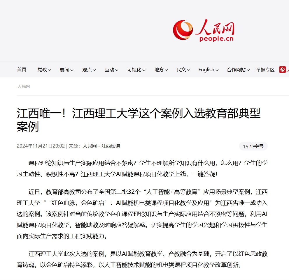 近日,教育部高教司公布了全国第二批32个“人工智能+高等教育”应用场景典型案例,江西理工大学“‘红色血脉,金色矿冶’:AI赋能机电类课程项目化教学及应用”为江西省唯一成功入选的案例。该案例针对当前传统教学存在课程理论知识与生产实际应用结合不紧密等问题,利用AI赋能课程项目化教学,智能助教及时响应答疑解惑。切实提高学生的学习兴趣和学习积极性与学生面向实际生产需求的工程实践能力。