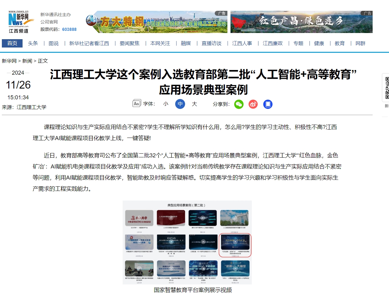 江西理工大学案例的成功入选,具有示范性和影响力,有力推动学校教学方法改革,教学手段更新。学校将以此为契机,继续推进人工智能+高等教育的发展,将信息化技术运用到教育教学中,赋能教育教学的高质量发展。