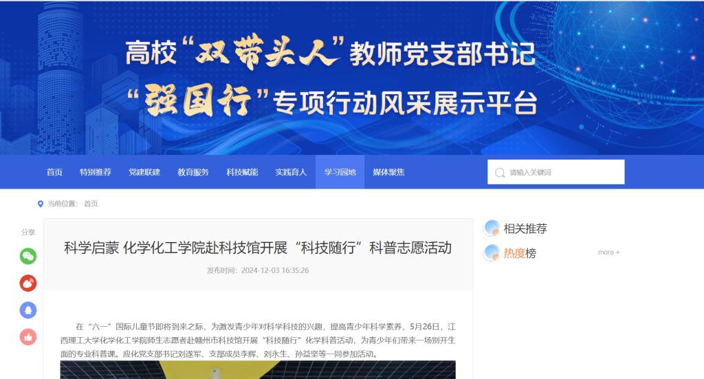 据悉,江西理工大学应化党支部充分把握双带头人工作室建设的机遇,围绕党建、科研、教学和学科发展的中心任务,开展星光引航工程,通过“星引领、星示范、星服务”三星行动,压实责任,推进支部建设。本次“科技随行”化学科普活动为应化党支部开展星示范活动的典型范例,通过1个科普团队+1个科普基地+1个科普品牌的科普传播方式,发挥党建工作示范作用,推动党建出成效。
