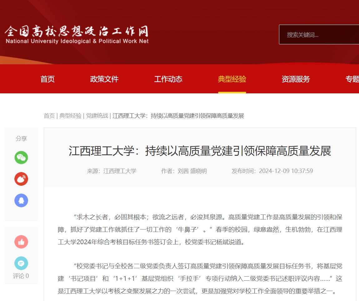 “校党委书记与全校各二级党委负责人签订高质量党建引领保障高质量发展目标任务书,将基层党建‘书记项目’和‘1+1+1’基层党组织‘手拉手’专项行动纳入二级党委书记述职评议内容……”这是江西理工大学以考核之变聚发展之力的一次尝试,更是加强党对学校工作全面领导的重要举措之一。