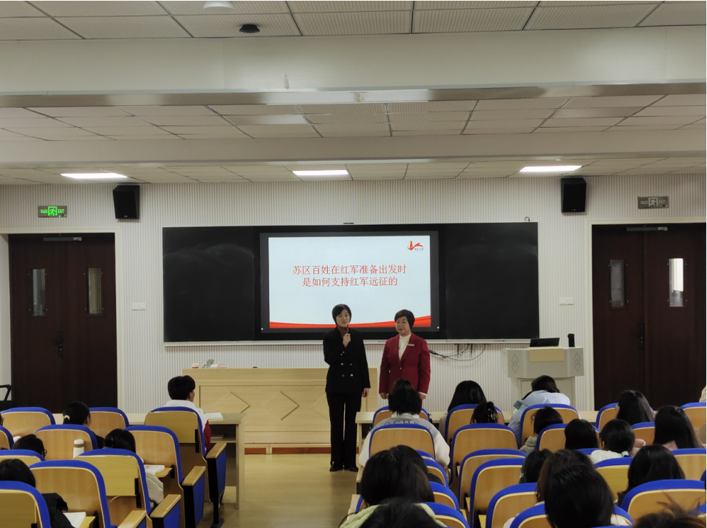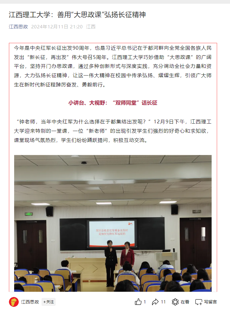 江西理工大学积极探索教学新模式,邀请了全国人大代表、于都中央红军长征集结出发历史博物馆纪念园管理办主任钟敏老师和马克思主义学院朱贤凌老师共同开展思政课“双师同堂”活动。钟敏老师曾为习近平总书记讲解介绍,得到总书记的高度评价。她凭借丰富的历史知识和生动的讲述技巧,把中央红军长征出发时那饱含悲壮色彩的场景与触动人心的故事栩栩如生地展现于学生眼前。她重点地讲述了苏区百姓如何毫无保留、竭尽所能地全力支援红军的动人情节,以及赣南子弟在长征漫漫征途中所作出的不可磨灭的卓越贡献。从百姓们省吃俭用为红军战士筹备粮食衣物,到青壮年义无反顾投身革命队伍踏上长征路;从军民齐心共克时艰的感人瞬间,到长征途中一个个彰显信念与情谊的经典事例,她皆细致入微地进行描绘。