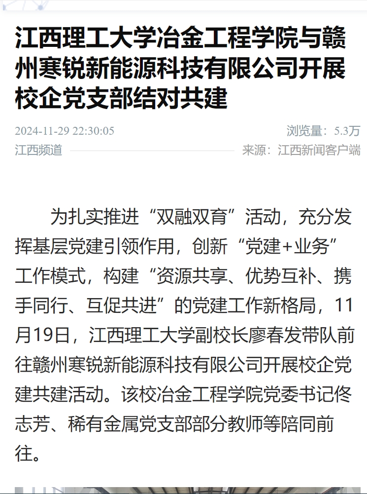 为扎实推进“双融双育”活动,充分发挥基层党建引领作用,创新“党建+业务”工作模式,构建“资源共享、优势互补、携手同行、互促共进”的党建工作新格局,11月19日,江西理工大学副校长廖春发带队前往赣州寒锐新能源科技有限公司开展校企党建共建活动。该校冶金工程学院党委书记佟志芳、稀有金属党支部部分教师等陪同前往。