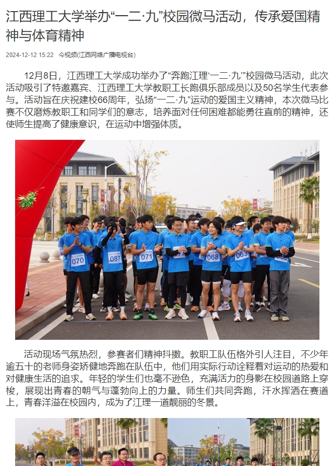 12月8日,江西理工大学成功举办了“奔跑江理‘一二·九’”校园微马活动,此次活动吸引了特邀嘉宾、江西理工大学教职工长跑俱乐部成员以及50名学生代表参与。活动旨在庆祝建校66周年,弘扬“一二·九”运动的爱国主义精神,本次微马比赛不仅磨炼教职工和同学们的意志,培养面对任何困难都能勇往直前的精神,还使师生提高了健康意识,在运动中增强体质。