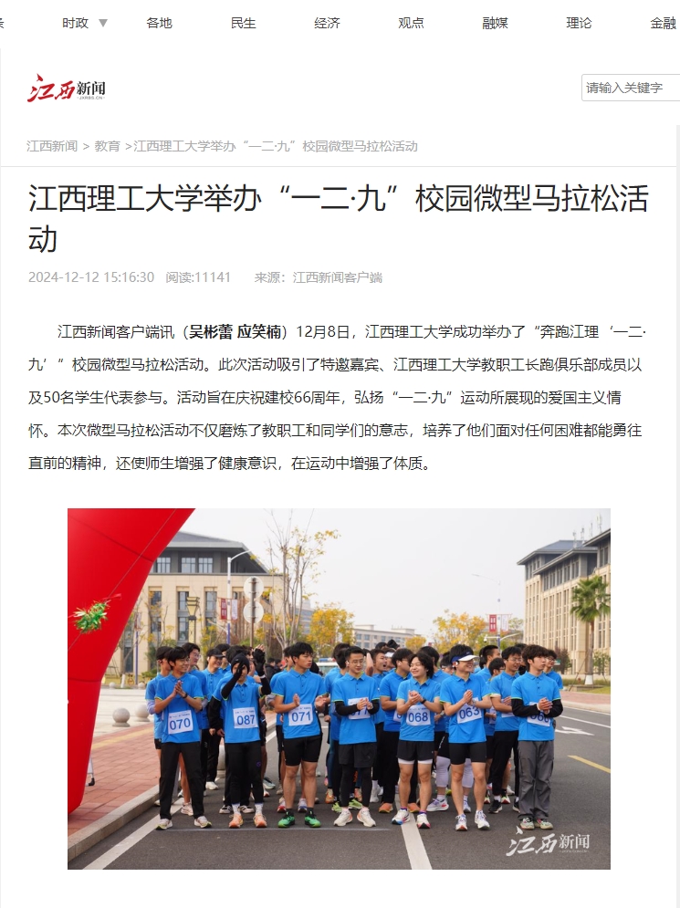 12月8日,江西理工大学成功举办了“奔跑江理‘一二·九’”校园微型马拉松活动。此次活动吸引了特邀嘉宾、江西理工大学教职工长跑俱乐部成员以及50名学生代表参与。活动旨在庆祝建校66周年,弘扬“一二·九”运动所展现的爱国主义情怀。本次微型马拉松活动不仅磨炼了教职工和同学们的意志,培养了他们面对任何困难都能勇往直前的精神,还使师生增强了健康意识,在运动中增强了体质。