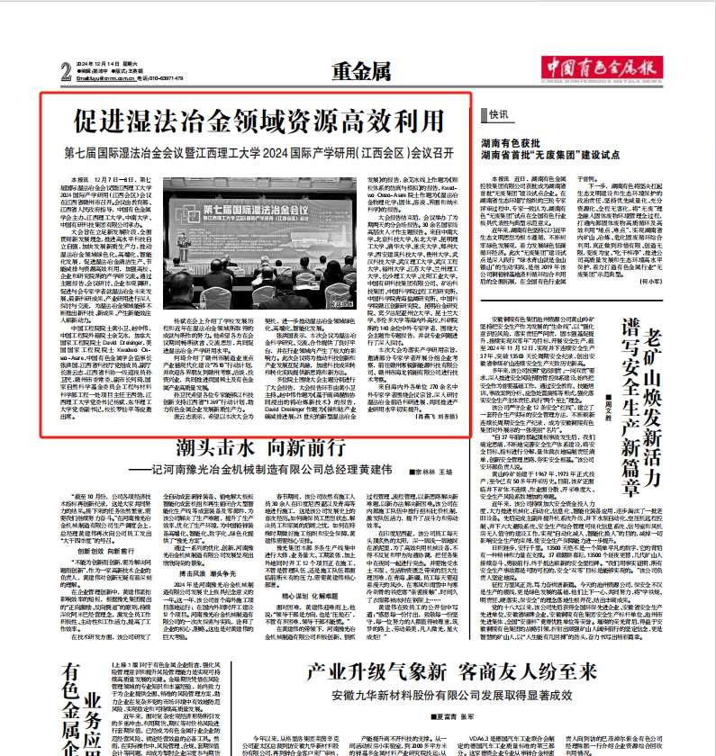 本报讯 12月7日—8日,第七届国际湿法冶金会议暨江西理工大学2024 国际产学研用(江西会区)会议在江西省赣州市召开。会议由教育部、江西省人民政府指导,中国有色金属学会主办,江西理工大学、中南大学、中国有研科技集团有限公司承办。
