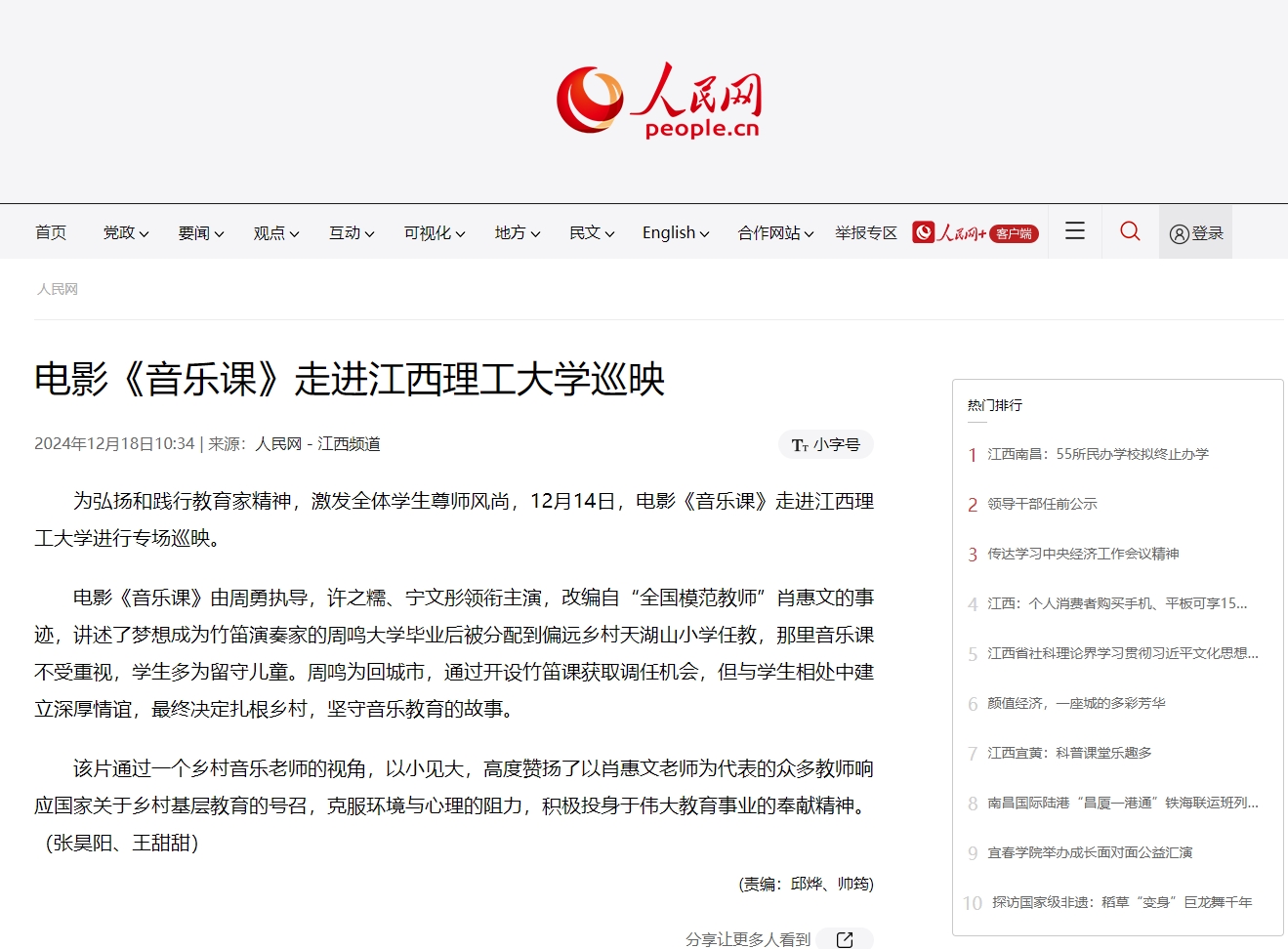 《人民网》:电影《音乐课》走进江西理工大学巡映