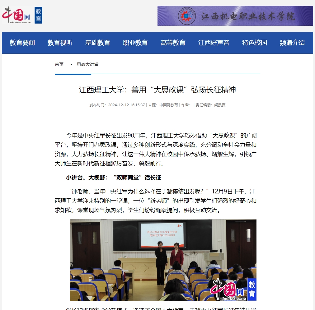 “学校地处赣南革命老区,这里丰富的红色资源,为‘大思政课’提供了得天独厚的条件。我们积极整合校内外资源,开发了‘长征第一渡’‘模范兴国’等这类数字化教学项目,用虚拟现实技术重现历史情境,让思政课不再局限于书本、课堂。”学校马克思主义学院党委书记钟明荣介绍道。