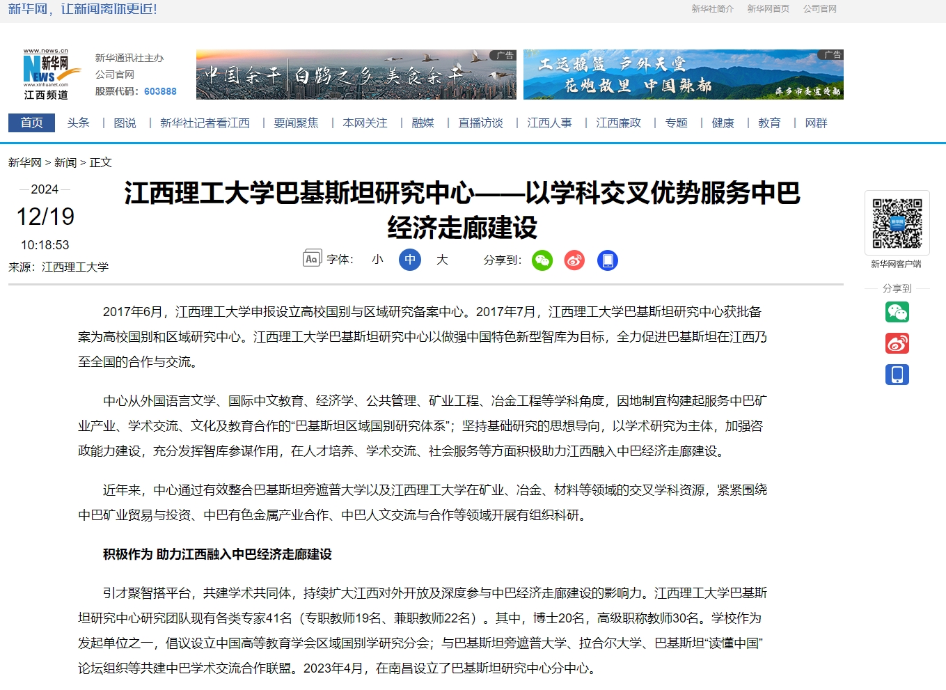 为了更好发挥智库参谋作用,打造咨政服务和基础研究的高地,江西理工大学巴基斯坦研究中心高度重视内涵建设,在队伍建设、科学研究、咨政服务、服务中企等方面日渐凸显自身优势及特色。2024年9月,以“江西理工大学、赣州市及江西省融入中巴经济走廊产业合作成就”为主题的巴基斯坦展示馆建成开馆。