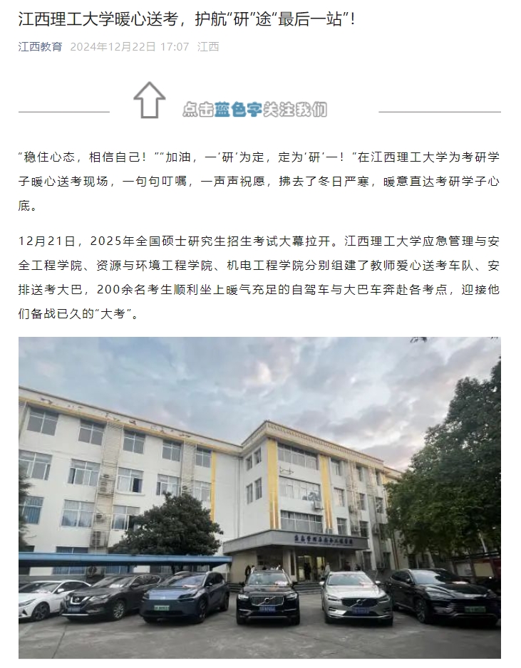 2025届江西理工大学考研学子坐上送考车辆出发考场当一辆辆送考车辆缓缓启动时,考研学子背负着梦想和希望,踏上了通向成功的征程。无声的出征号角响起,鼓动着每个考研学子的心。车队缓缓启动,送考途中,自驾送考的老师与送考大巴皆严格遵守交通规则,把控行车速度,确保安全、准时将考生们送达考场。此外,他们还时刻关注考生们的情绪状态,及时疏导大家的紧张情绪,增强应试信心。“研”途漫漫,昼夜兼程,各种滋味只有自己品尝。回首望去,备战考研的征途,江理的考研学子从来不是孤军奋战。