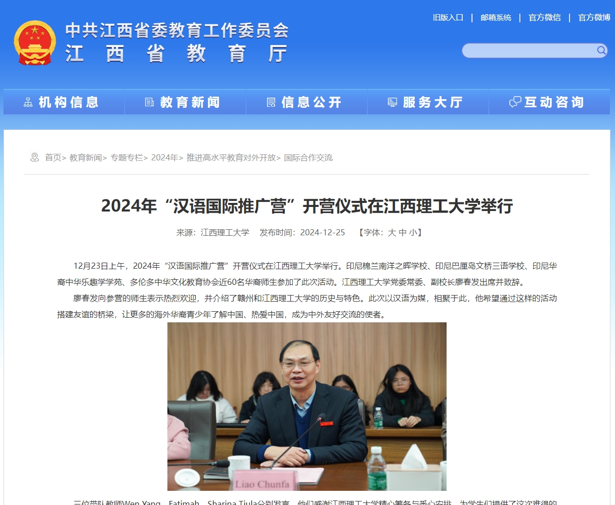 12月23日上午,2024年“汉语国际推广营”开营仪式在江西理工大学举行。印尼棉兰南洋之晖学校、印尼巴厘岛文桥三语学校、印尼华裔中华乐趣学学苑、多伦多中华文化教育协会近60名华裔师生参加了此次活动。江西理工大学党委常委、副校长廖春发出席并致辞。