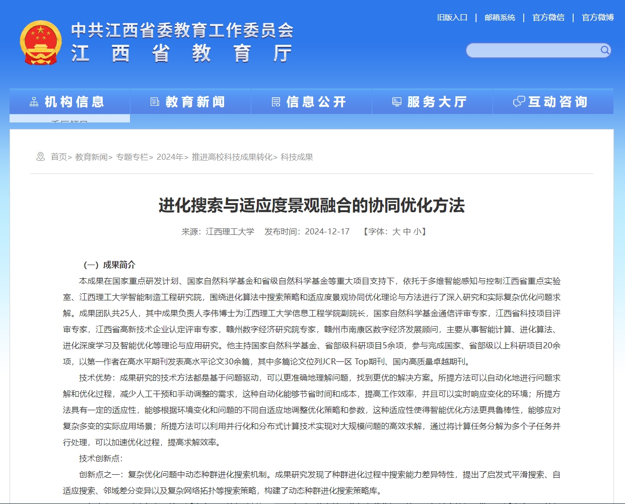 本成果在国家重点研发计划、国家自然科学基金和省级自然科学基金等重大项目支持下,依托于多维智能感知与控制江西省重点实验室、江西理工大学智能制造工程研究院,围绕进化算法中搜索策略和适应度景观协同优化理论与方法进行了深入研究和实际复杂优化问题求解。成果团队共25人,其中成果负责人李伟博士为江西理工大学信息工程学院副院长,国家自然科学基金通信评审专家,江西省科技项目评审专家,江西省高新技术企业认定评审专家,赣州数字经济研究院专家,赣州市南康区数字经济发展顾问,主要从事智能计算、进化算法、进化深度学习及智能优化等理论与应用研究。他主持国家自然科学基金、省部级科研项目5余项,参与完成国家、省部级以上科研项目20余项,以第一作者在高水平期刊发表高水平论文30余篇,其中多篇论文位列JCR一区 Top期刊、国内高质量卓越期刊。