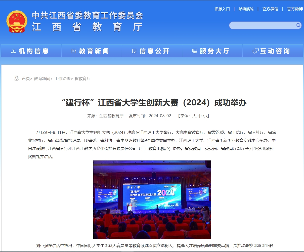 7月29日-8月1日,江西省大学生创新大赛(2024)决赛在江西理工大学举行。大赛由省教育厅、省发改委、省工信厅、省人社厅、省农业农村厅、省市场监督管理局、团省委、省科协、省中华职教社等9个单位共同主办,江西理工大学、江西省创新创业教育实践中心承办,中国建设银行江西省分行和江西江教之声文化传播有限责任公司(江西教育电视台)协办。省委教育工委委员、省教育厅副厅长刘小强出席颁奖典礼并讲话。