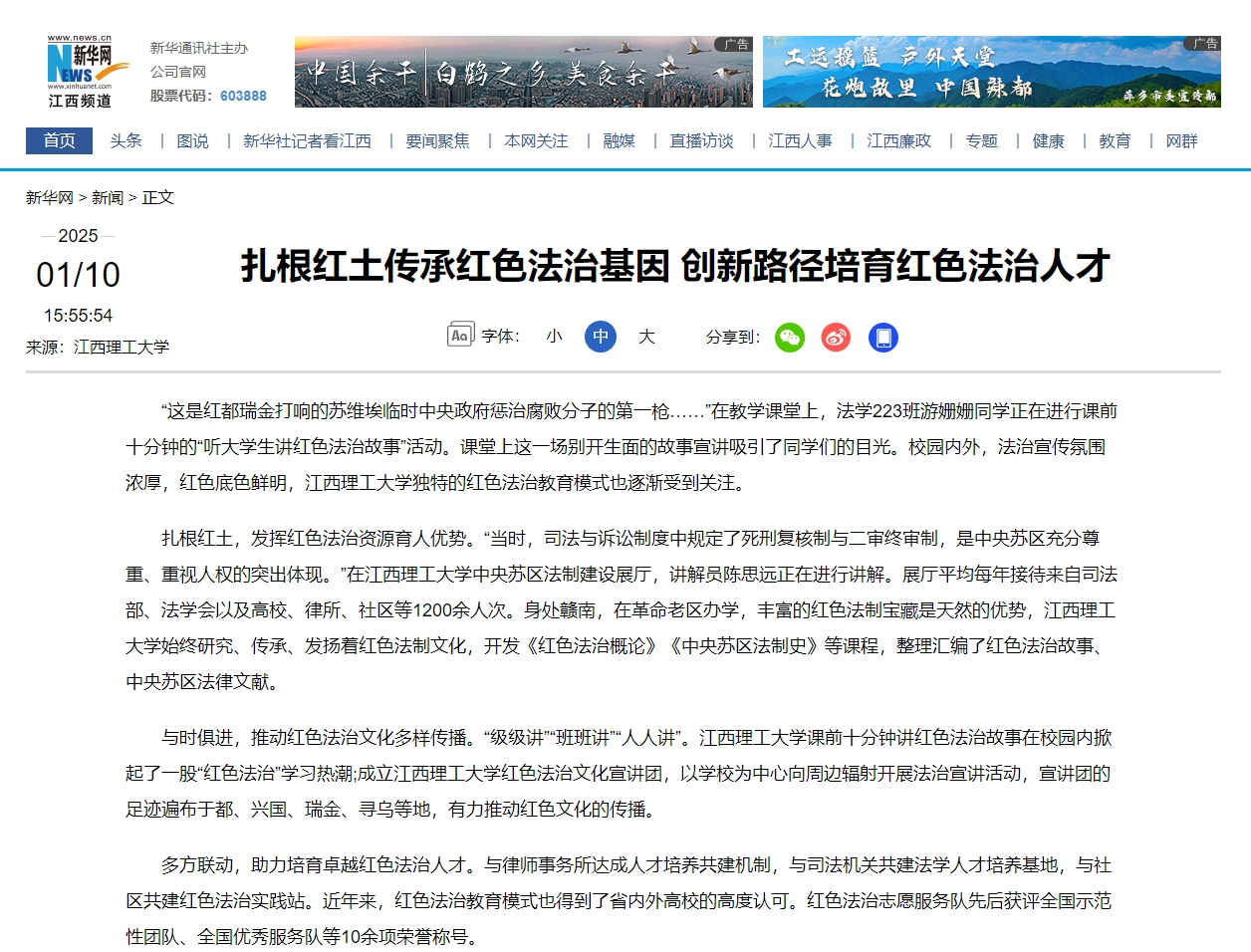 红色法治文化是中国法治建设的重要资源,江西理工大学将扎根中国大地,立足中国国情,不断推动红色法治文化创造性转化和创新性发展,为推进新时代法治中国建设贡献力量。