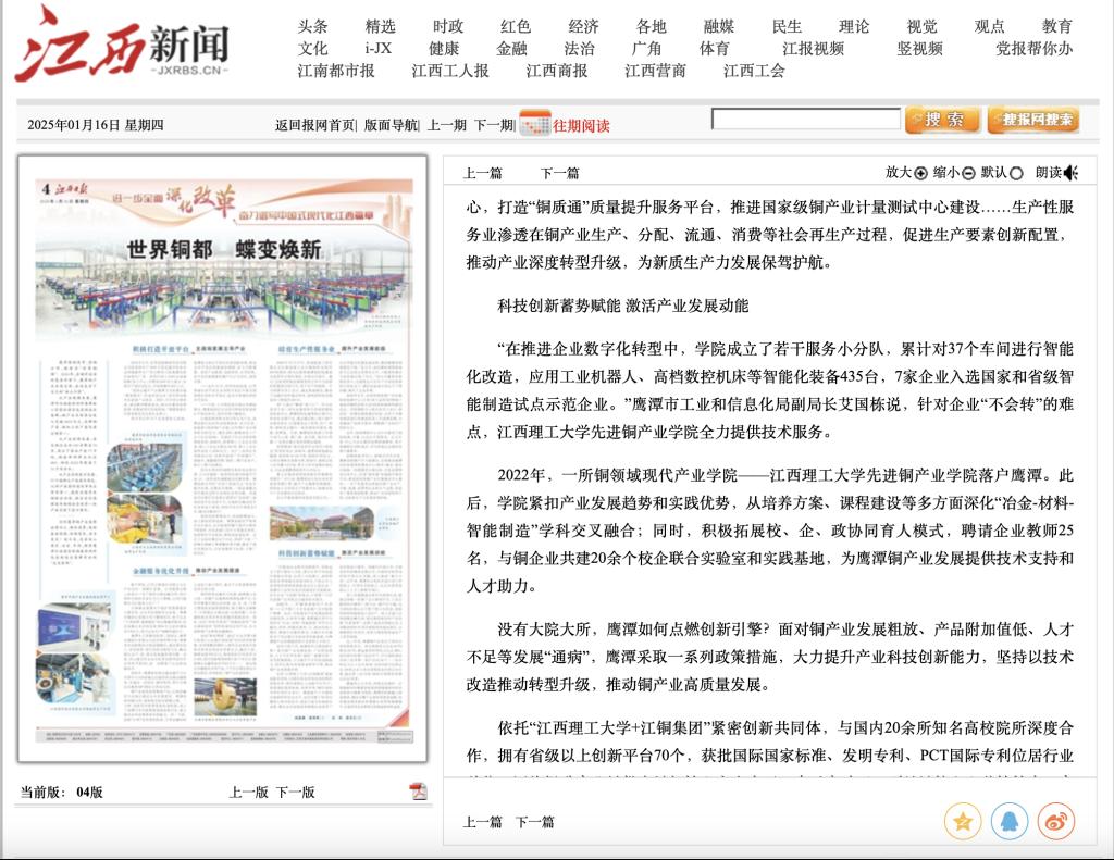 2022年,一所铜领域现代产业学院——江西理工大学先进铜产业学院落户鹰潭。此后,学院紧扣产业发展趋势和实践优势,从培养方案、课程建设等多方面深化“冶金-材料-智能制造”学科交叉融合;同时,积极拓展校、企、政协同育人模式,聘请企业教师25名,与铜企业共建20余个校企联合实验室和实践基地,为鹰潭铜产业发展提供技术支持和人才助力。