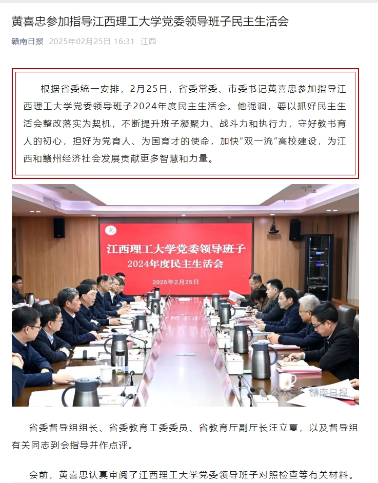 会前,黄喜忠认真审阅了江西理工大学党委领导班子对照检查等有关材料。会上,江西理工大学党委书记杨斌通报了巡视整改专题民主生活会整改措施落实情况和2024年度民主生活会征求意见情况,学校党委领导班子和班子成员进行了对照检查,开展了批评和自我批评。