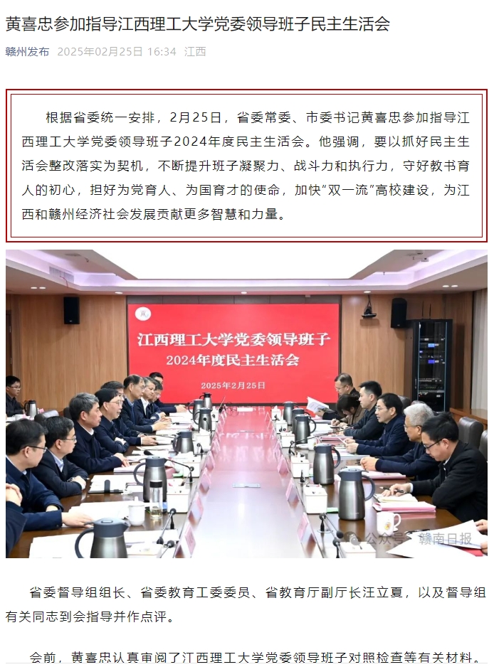 会前,黄喜忠认真审阅了江西理工大学党委领导班子对照检查等有关材料。会上,江西理工大学党委书记杨斌通报了巡视整改专题民主生活会整改措施落实情况和2024年度民主生活会征求意见情况,学校党委领导班子和班子成员进行了对照检查,开展了批评和自我批评。