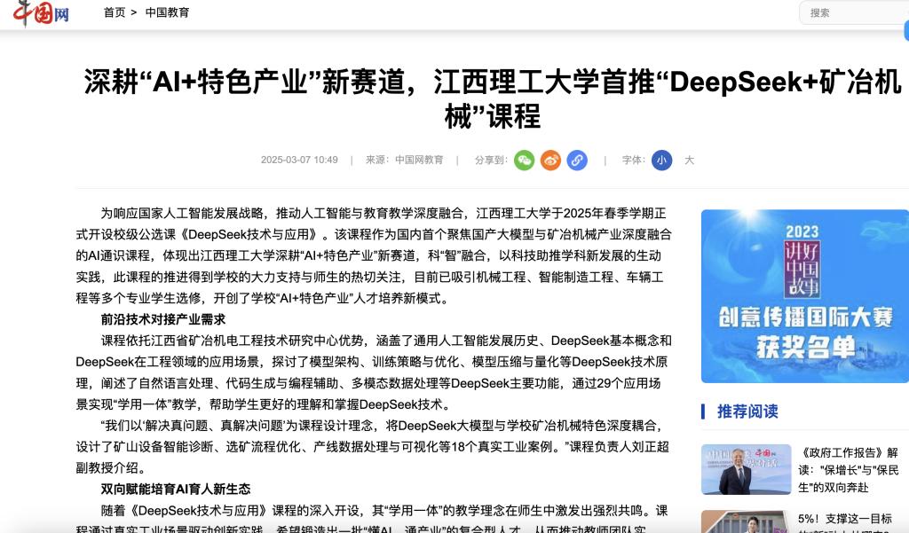 为响应国家人工智能发展战略,推动人工智能与教育教学深度融合,江西理工大学于2025年春季学期正式开设校级公选课《DeepSeek技术与应用》。该课程作为国内首个聚焦国产大模型与矿冶机械产业深度融合的AI通识课程,体现出江西理工大学深耕“AI+特色产业”新赛道,科“智”融合,以科技助推学科新发展的生动实践,此课程的推进得到学校的大力支持与师生的热切关注,目前已吸引机械工程、智能制造工程、车辆工程等多个专业学生选修,开创了学校“AI+特色产业”人才培养新模式。