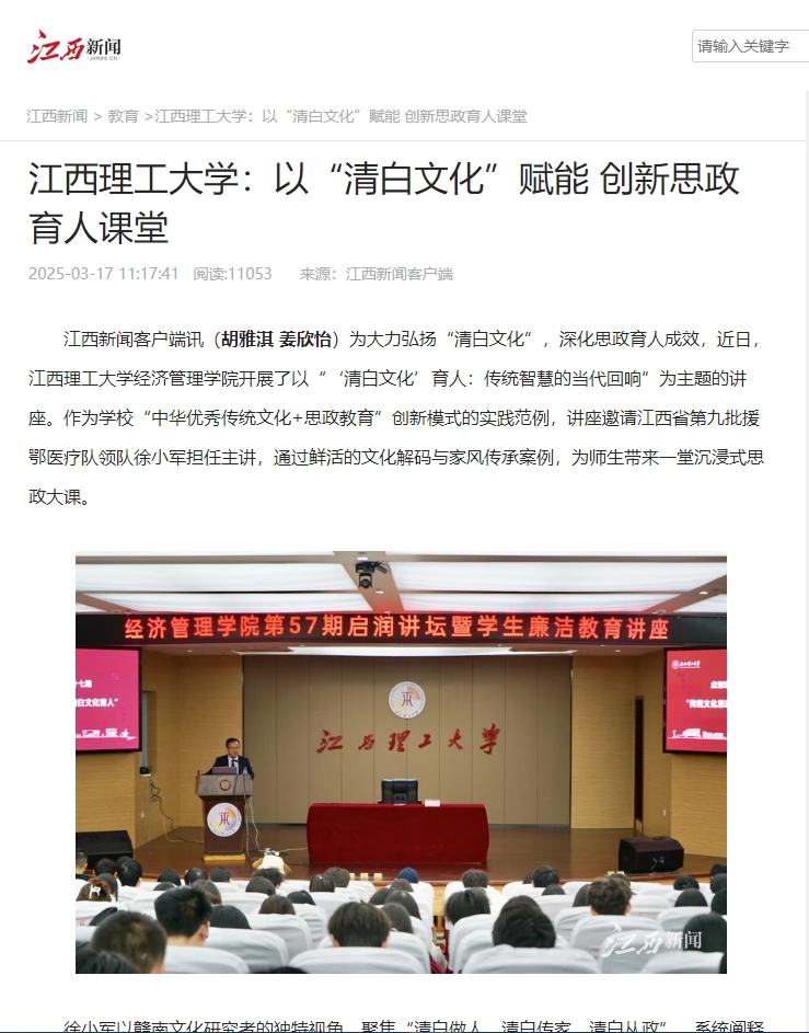为大力弘扬“清白文化”,深化思政育人成效,近日,江西理工大学经济管理学院开展了以“‘清白文化’育人:传统智慧的当代回响”为主题的讲座。作为学校“中华优秀传统文化+思政教育”创新模式的实践范例,讲座邀请江西省第九批援鄂医疗队领队徐小军担任主讲,通过鲜活的文化解码与家风传承案例,为师生带来一堂沉浸式思政大课。