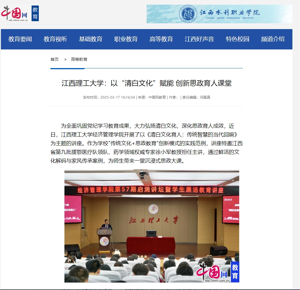 为全面巩固党纪学习教育成果,大力弘扬清白文化,深化思政育人成效,近日,江西理工大学经济管理学院开展了以《清白文化育人:传统智慧的当代回响》为主题的讲座。作为学校"传统文化+思政教育"创新模式的实践范例,讲座特邀江西省第九批援鄂医疗队领队、药学领域权威专家徐小军教授担任主讲,通过鲜活的文化解码与家风传承案例,为师生带来一堂沉浸式思政大课。