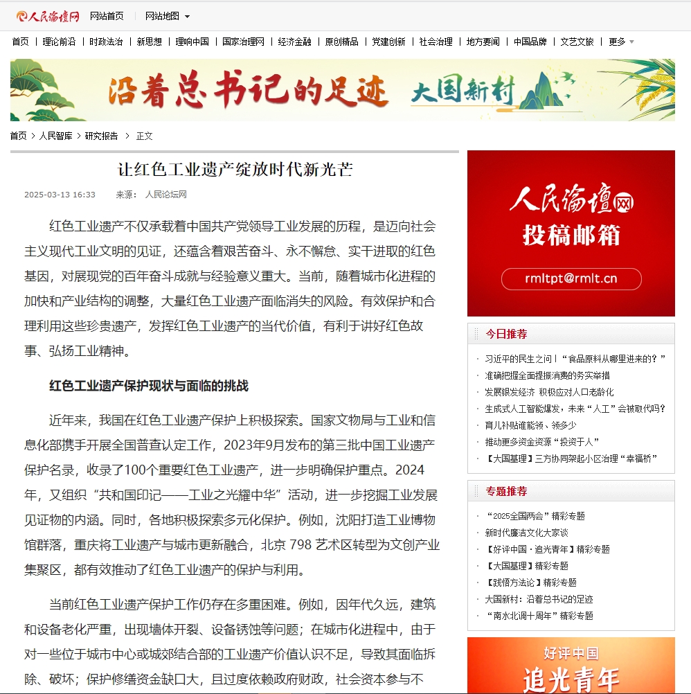 近年来,我国在红色工业遗产保护上积极探索。国家文物局与工业和信息化部携手开展全国普查认定工作,2023年9月发布的第三批中国工业遗产保护名录,收录了100个重要红色工业遗产,进一步明确保护重点。2024年,又组织“共和国印记——工业之光耀中华”活动,进一步挖掘工业发展见证物的内涵。同时,各地积极探索多元化保护。例如,沈阳打造工业博物馆群落,重庆将工业遗产与城市更新融合,北京 798 艺术区转型为文创产业集聚区,都有效推动了红色工业遗产的保护与利用。