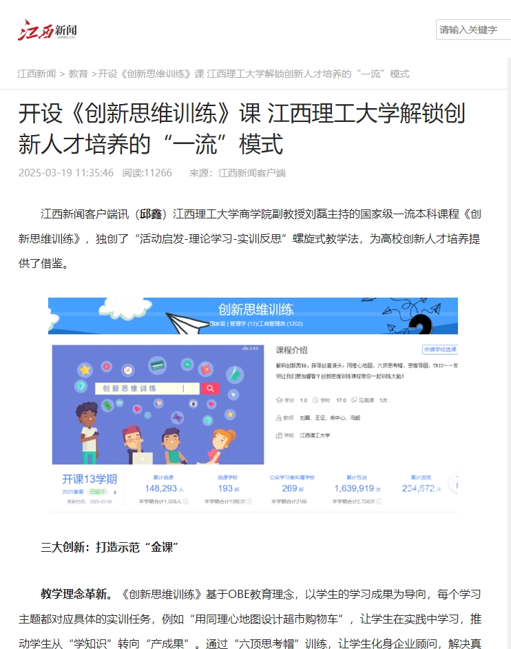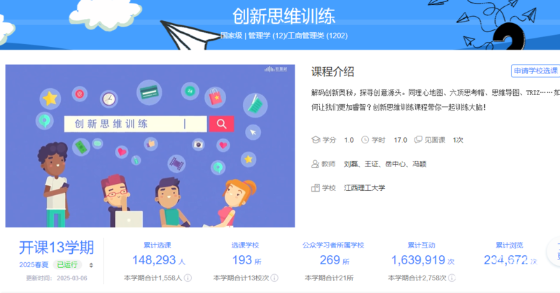 在跨校共享方面,课程目前已服务南昌大学等186所高校,累计选课14.68万人次。通过跨校共享,课程将江西理工大学的创新教育理念和方法传播到全国,为更多高校的创新人才培养提供了有益借鉴。