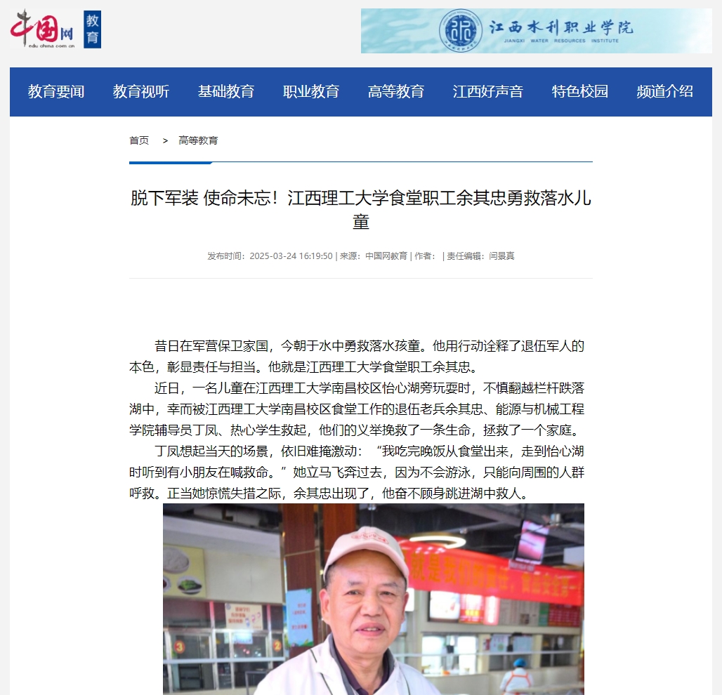 昔日在军营保卫家国,今朝于水中勇救落水孩童。他用行动诠释了退伍军人的本色,彰显责任与担当。他就是江西理工大学食堂职工余其忠。