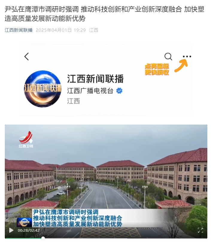 《江西新闻联播》:尹弘在鹰潭市调研时强调 推动科技创新和产业创新深度融合 加快塑造高质量发展新动能新优势