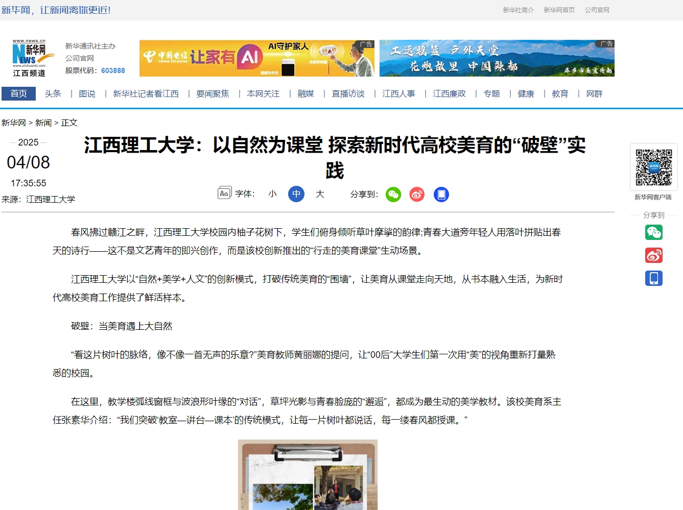 江西理工大学以“自然+美学+人文”的创新模式,打破传统美育的“围墙”,让美育从课堂走向天地,从书本融入生活,为新时代高校美育工作提供了鲜活样本。