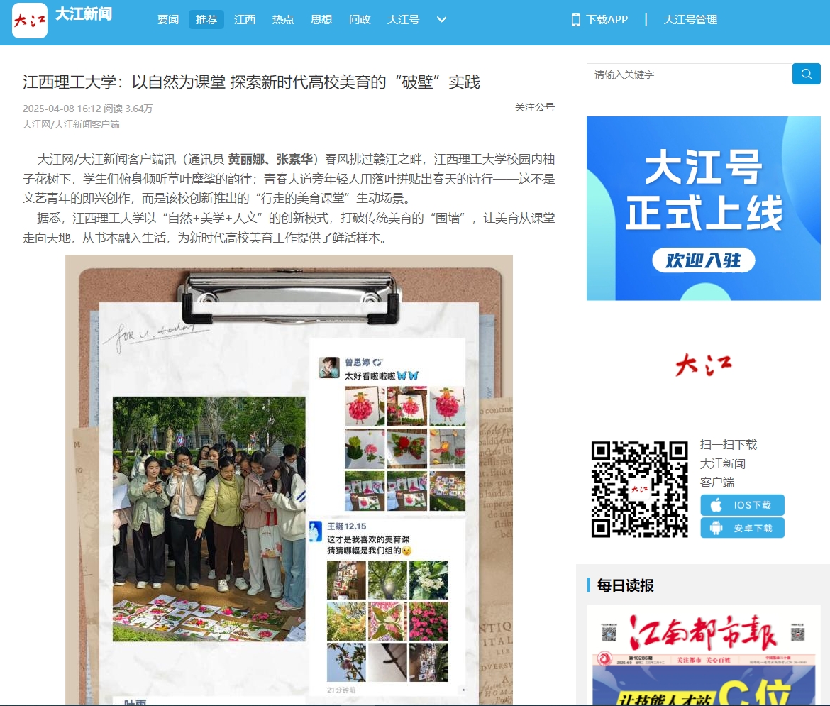 大江网/大江新闻客户端讯(通讯员黄丽娜、张素华)春风拂过赣江之畔,江西理工大学校园内柚子花树下,学生们俯身倾听草叶摩挲的韵律;青春大道旁年轻人用落叶拼贴出春天的诗行——这不是文艺青年的即兴创作,而是该校创新推出的“行走的美育课堂”生动场景。