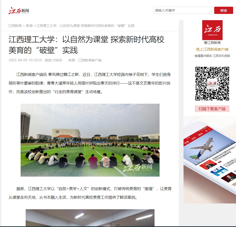 据悉,江西理工大学以“自然+美学+人文”的创新模式,打破传统美育的“围墙”,让美育从课堂走向天地,从书本融入生活,为新时代高校美育工作提供了鲜活案例。