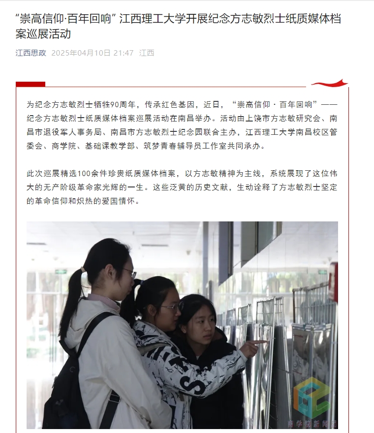 为纪念方志敏烈士牺牲90周年,传承红色基因,近日,“崇高信仰·百年回响”——纪念方志敏烈士纸质媒体档案巡展活动在南昌举办。活动由上饶市方志敏研究会、南昌市退役军人事务局、南昌市方志敏烈士纪念园联合主办,江西理工大学南昌校区管委会、商学院、基础课教学部、筑梦青春辅导员工作室共同承办。