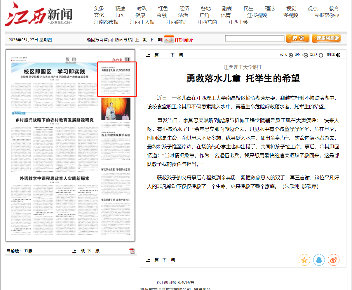 近日,一名儿童在江西理工大学南昌校区怡心湖旁玩耍,翻越栏杆时不慎跌落湖中,该校食堂职工余其忠不假思索跳入水中,冒着生命危险解救落水者,托举生的希望。