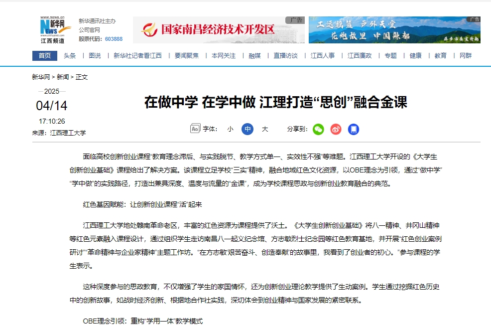 面临高校创新创业课程“教育理念滞后、与实践脱节、教学方式单一、实效性不强”等难题。江西理工大学开设的《大学生创新创业基础》课程给出了解决方案。该课程立足学校“三实”精神,融合地域红色文化资源,以OBE理念为引领,通过“做中学”“学中做”的实践路径,打造出兼具深度、温度与流量的“金课”,成为学校课程思政与创新创业教育融合的典范。
