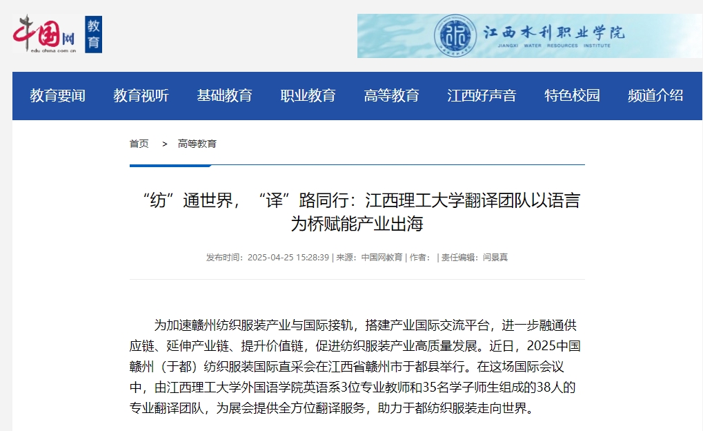 江西理工大学外国语学院师生在直采会中的表现,不仅展现了高校翻译人才培养的显著成果,更印证了“语言联通世界”的深远意义。在为赣州纺织服装“出海”按下加速键的同时,更是践行深化应用型人才培养改革的生动注脚。当纺织服装产业的“中国制造”通过精准的语言走向全球,当江理学子在实战中成长为行业需要的复合型人才,这条产教融合的道路,正为地方经济的高质量发展注入新的活力。(尧佳琳、徐玉冉)