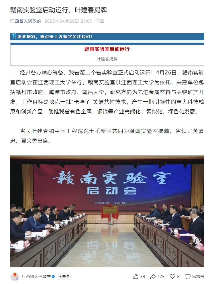 经过各方精心筹备,我省第二个省实验室正式启动运行!4月26日,赣南实验室启动会在江西理工大学举行。赣南实验室以江西理工大学为依托,共建单位包括赣州市政府、鹰潭市政府、南昌大学,研究方向为先进金属材料与关键矿产开发,工作目标是攻克一批“卡脖子”关键共性技术,产生一批引领性的重大科技成果和创新产品,助推我省有色金属、钢铁等产业高端化、智能化、绿色化发展。