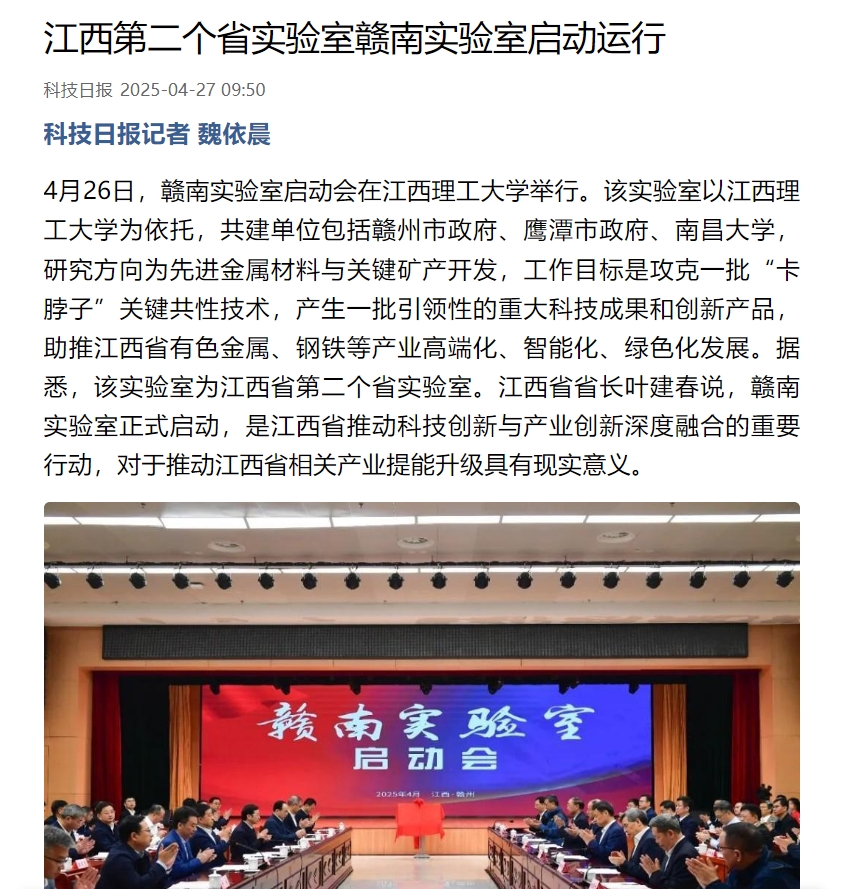 4月26日,赣南实验室启动会在江西理工大学举行。该实验室以江西理工大学为依托,共建单位包括赣州市政府、鹰潭市政府、南昌大学,研究方向为先进金属材料与关键矿产开发,工作目标是攻克一批“卡脖子”关键共性技术,产生一批引领性的重大科技成果和创新产品,助推江西省有色金属、钢铁等产业高端化、智能化、绿色化发展。据悉,该实验室为江西省第二个省实验室。江西省省长叶建春说,赣南实验室正式启动,是江西省推动科技创新与产业创新深度融合的重要行动,对于推动江西省相关产业提能升级具有现实意义。