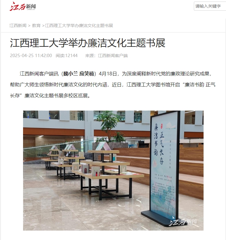 江西新闻客户端讯(魏小兰 应笑楠)4月18日,为深度阐释新时代党的廉政理论研究成果,帮助广大师生领悟新时代廉洁文化的时代内涵,近日,江西理工大学图书馆开启“廉洁书韵 正气长存”廉洁文化主题书展多校区巡展。