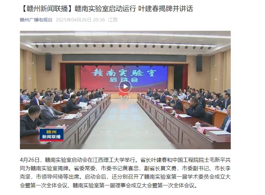 4月26日,赣南实验室启动会在江西理工大学举行。省长叶建春和中国工程院院士毛新平共同为赣南实验室揭牌。省委常委、市委书记黄喜忠,副省长夏文勇,市委副书记、市长李克坚,市领导何琦等出席。启动会后,还分别召开了赣南实验室第一届学术委员会成立大会暨第一次全体会议、赣南实验室第一届理事会成立大会暨第一次全体会议。