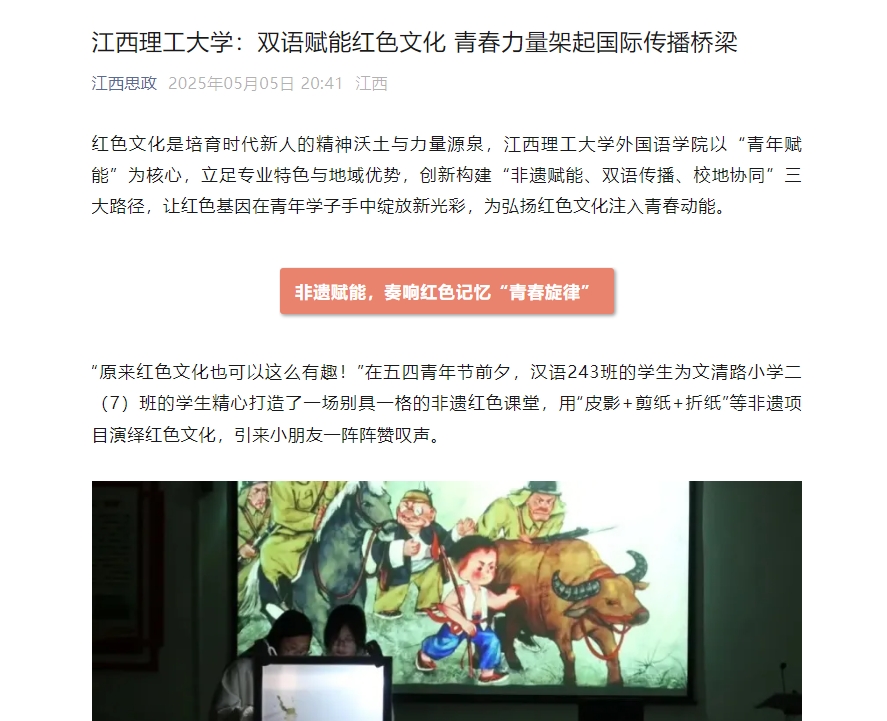 红色文化是培育时代新人的精神沃土与力量源泉,江西理工大学外国语学院以“青年赋能”为核心,立足专业特色与地域优势,创新构建“非遗赋能、双语传播、校地协同”三大路径,让红色基因在青年学子手中绽放新光彩,为弘扬红色文化注入青春动能。