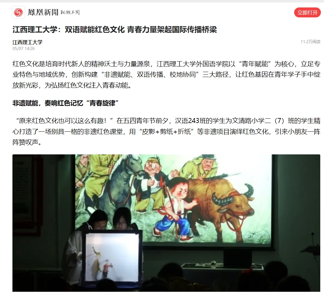 红色文化是培育时代新人的精神沃土与力量源泉,江西理工大学外国语学院以“青年赋能”为核心,立足专业特色与地域优势,创新构建“非遗赋能、双语传播、校地协同”三大路径,让红色基因在青年学子手中绽放新光彩,为弘扬红色文化注入青春动能。