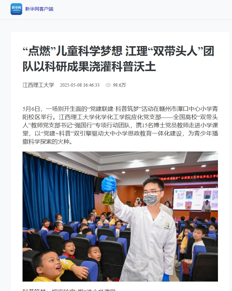 5月6日,一场别开生面的“党建联建·科普筑梦”活动在赣州市潭口中心小学青阳校区举行。江西理工大学化学化工学院应化党支部——全国高校“双带头人”教师党支部书记“强国行”专项行动团队,携15名博士党员教师走进小学课堂,以“党建+科普”双引擎驱动大中小学思政教育一体化建设,为青少年播撒科学探索的火种。